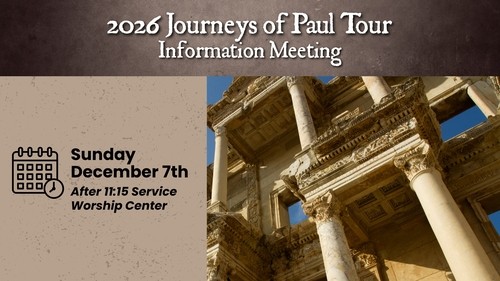 If you have signed up for our 2026 Journeys of Paul Tour, please attend an information meeting on Sunday, December 7th. We'll meet in the Worship Center after the 11:15 AM worship service to hear essential details and answer any questions you may have. If you haven't signed up but are interested, please join us to learn more.