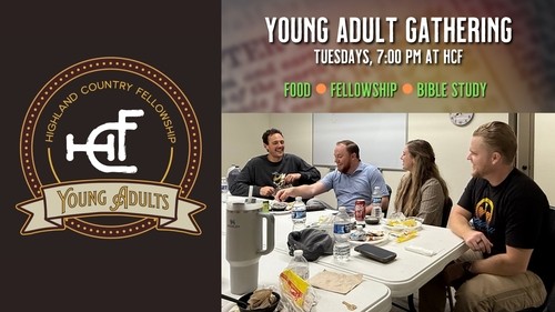 HCF young adults are invited to our weekly gathering, now hosted at the church. Each week, we gather together for food, fellowship, and Bible study. These casual gatherings are on Tuesdays at 7:00 PM.